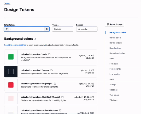 We are extremely excited to announce that we have released a new version of the tokens list page! It has a streamlined and improved design with the ability to search through token names and values, quick copy buttons for each token, and switch between JavaScript and CSS formats. You can also watch our walkthrough of the new features(link takes you to an external page).